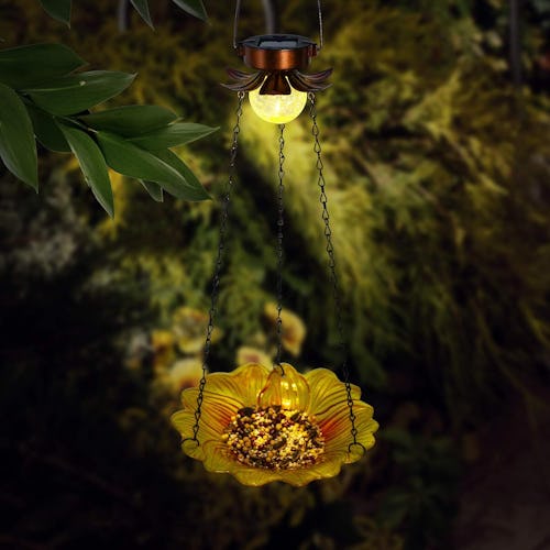 This solar bird bath functions as both pretty decor and a practical addition to your backyard. Hang it from a branch or a shepherd's hook with the built-in metal handle and fill it with either water or seeds; the curved sunflower bowl offers a welcoming rest stop for birds, while the solar panel collects sunlight during the day to illuminate the crackle-glass bulb at night.