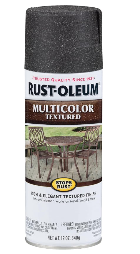 Every few years, I spray my metal firepit chairs with Rust-Oleum spray paint, and afterward, they look brand new — even though I leave them out year-round. The oil-based formula covers discoloration, stops rust, and protects items from chipping and damage. This particular spray creates a speckled multicolor finish on wood, metal, concrete, or masonry for a natural, stone-like look.