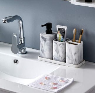 This vanity accessory set is an aesthetically pleasing way to keep clutter off your bathroom countertops. Made of durable resin with a marble look, these are attractive and stylish, but also functional. The set comes with two containers, a soap dispenser, and a tray to hold everything together, and each piece has a sturdy feel.