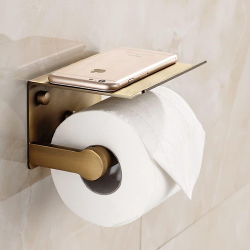 If you, like everyone else, have a habit of bringing your phone into the bathroom, then this toilet paper holder will come in handy. This gives you a place to put your toilet paper, but also has a little shelf on top that is perfect for safely stashing your phone. The brushed gold aluminum is so pretty to look at, too.