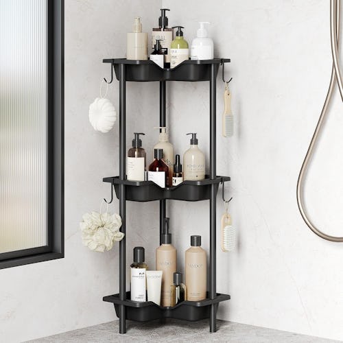 This standing caddy is a handy addition to any bathroom space. With three tiers and four hooks, there’s plenty of room for shower essentials and loofahs, even if the bottles are on the taller side. The legs are adjustable, which works well for uneven flooring, and the trays feature drainage holes so that water can filter through.