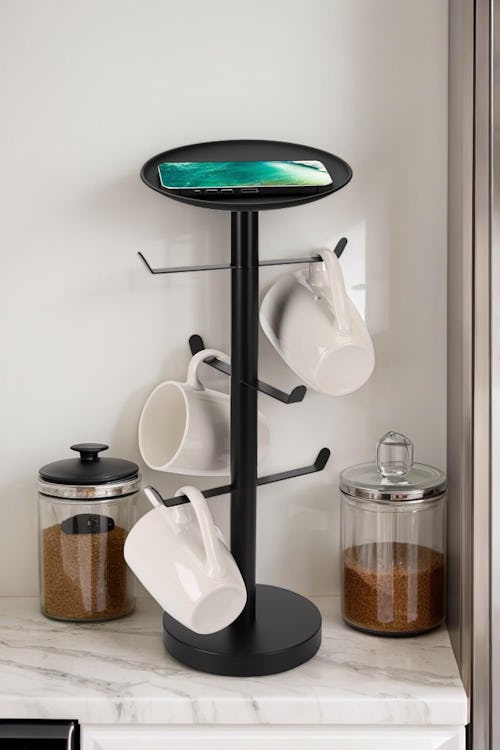 This mug tree is a great addition to any coffee or tea corner. With enough racks to hold up to six mugs, it helps save on space and make them easily accessible. It also has a small storage tray on top that can come in handy for stashing tea bags, coffee pods, and other accessories.