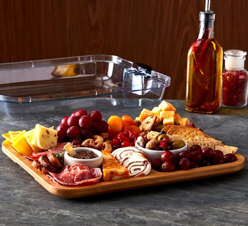 A sleek bamboo charcuterie board with a convenient lid