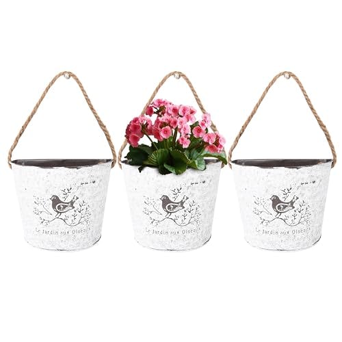 Rustic metal flower buckets that add farmhouse charm