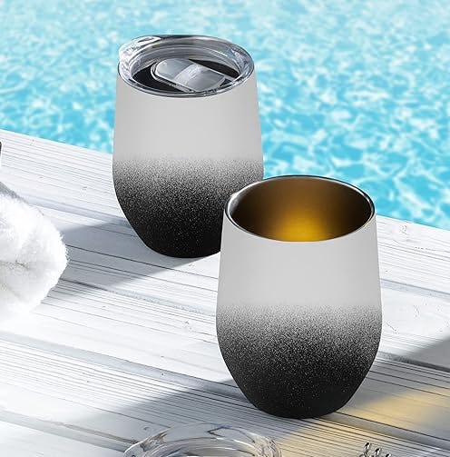 These insulated wine tumblers are perfect for enjoying your favorite drink outside of the house. The double-wall insulation helps keep beverages chilled up to 12 hours (or hot for up to six hours). Handy lids feature a rubber gasket that seals up to prevent leaks. They have a 12-ounce capacity, shatterproof design, and comfortable grip.