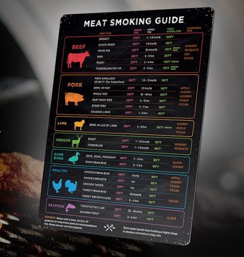 Up your grill game by keeping this magnetic smoking chart nearby. Designed to attach onto your grill so it’s always within viewing distance, it gives all the info you need: ideal smoking temperature, ideal internal temperature, and cook time for a wide variety of meats. It’s easy to follow and will make you a better grill master.
