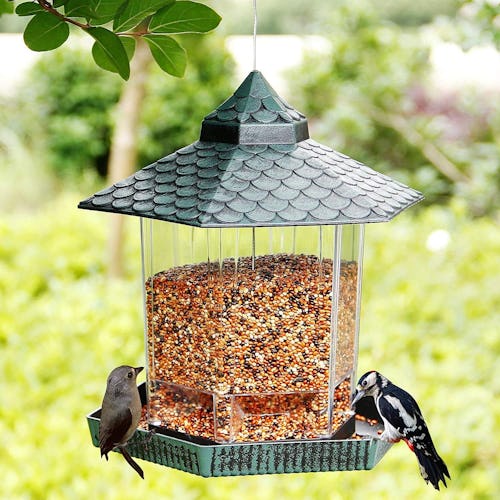 A large bird feeder with a handsome tile-look roof