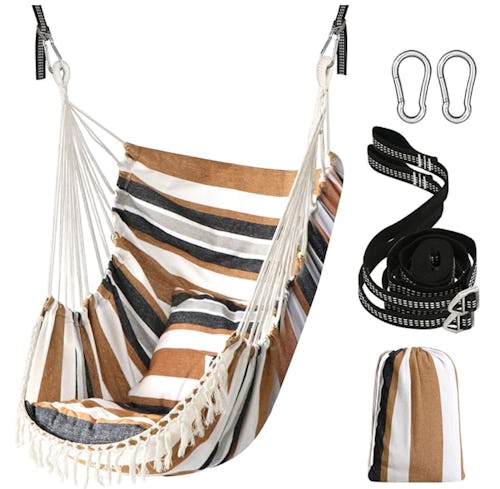 This hammock chair has the comfort of a traditional hammock, but without the threat of flipping you into the grass. It sways gently when you’re sitting on it and comes with two plush cushions for comfort. Two hanging straps or carabiners make it easy to hang from a tree, a ceiling joist, or hammock bar. When not in use, it folds up to fit in the included bag. Choose from eight different colors.