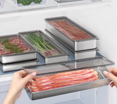 Made of stainless steel with a sealed, airtight plastic lid, this food storage container is designed for deli meats and cheeses (though it works for so much more) to keep everything fresh for longer. The base has a slightly raised texture that elevates the food and reduces contact with water for a better preserved storage environment.