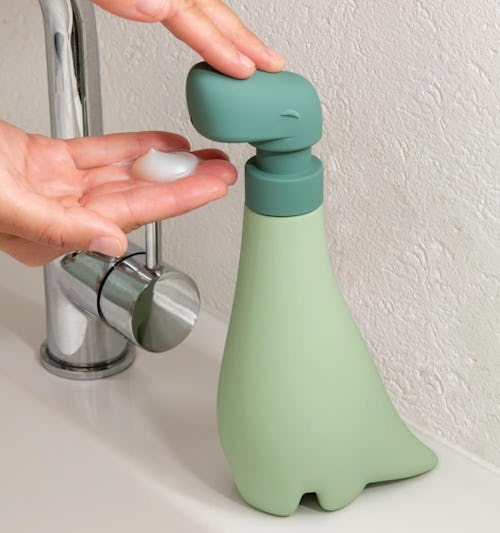 A ceramic dino-shaped soap dispenser that holds 9 ounces