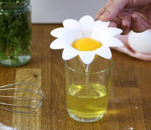 Take the mess and the guesswork out of separating the white from the yolks with the help of this egg separator. It has a flower shape that is cute, of course, but that also allows for the separator to sit on top of a cup so you can focus your hands on cracking an egg. The center of the flower holds the yolk while the whites flow through.