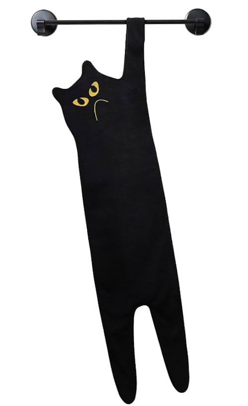 If the “hang in there” poster was a towel, this is it. This cat-shaped towel is made of quick-drying, highly absorbent, and durable fabric. And it has such a cute, kitschy design. It’s made with a hanging loop with a button fastener, so it looks like it’s hanging onto the towel rod by a thread.
