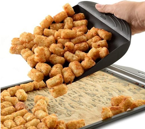 This extra-large spatula is a must-have for effortlessly transferring ingredients from sheet pan to plate. It’s great for large batch cooking like cookies, tater tots, roasted veggies, or chicken nuggets. It has an easy to grab handle, raised sides, and a tapered edge that slides easily underneath your food.