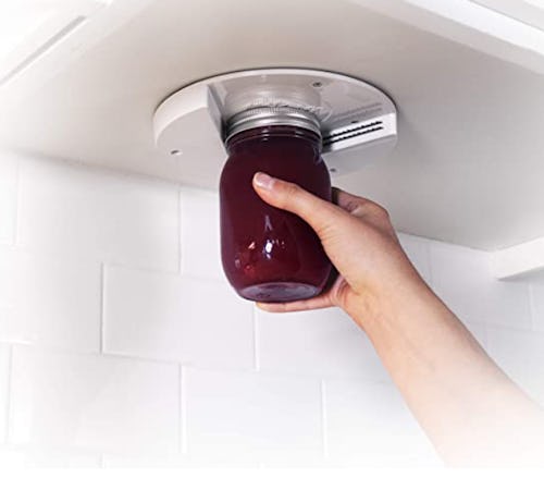 Mount this under-cabinet jar opener in your kitchen to effortlessly open stubborn bottles and jars using only one hand. It features a V-shaped opening coated with rust-proof zinc that grips lids up to five inches wide. To attach this freakishly smart gadget to your upper cabinets, simply peel off the self-adhesive backing, press to stick, and secure with the included screws.