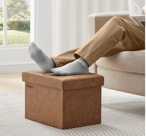 If you need a hidden spot to stash away clutter, look no further than this folding storage ottoman. It has an elegant faux leather exterior, and the lid showcases beautiful tufted detailing. Its thick padding maximizes comfort if you use the ottoman as a footrest. When not in use, the ottoman can be folded down for space-saving storage.