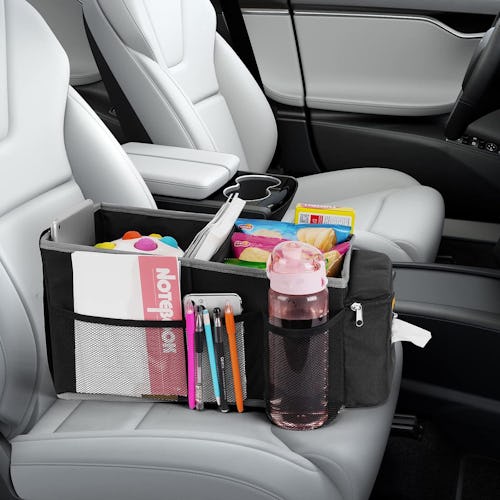 Keep road trip essentials neatly stored and within easy reach in the multiple compartments of this car seat organizer. The open interior has a removable divider and one zippered pocket, while the exterior has two cup holders, a zippered tissue box, and three large mesh pockets. To secure the organizer in place, just thread a seatbelt through the two loops on the back.