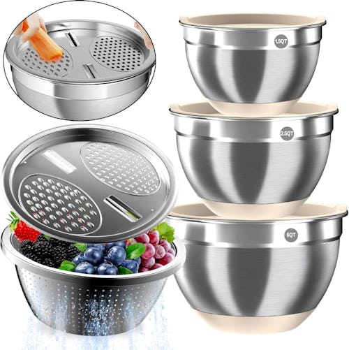 This set of three stainless steel mixing bowls includes airtight lids, so they aren’t just prep bowls — they double as storage containers. They have silicone bottoms to prevent shifting and come with a fitted colander and a grater attachment to maximize function. The heavy-duty bowls are dishwasher-safe, and their nesting design saves storage space.