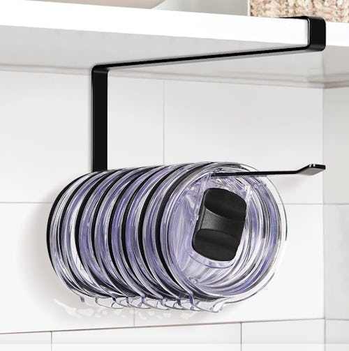 Having a collection of insulated travel tumblers is awesome. Finding a lid for the one you want to use is not. This tumbler lid organizer fixes that. Hook it from a cabinet shelf and slide the lids onto it. They will be tidy, accessible, and easy to find. The organizer holds up to 10 lids and comes in black or white.