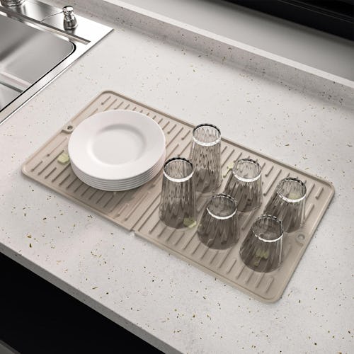 Made of heat-resistant silicone, this mat can be used as a dish drying surface or as a trivet for hot dishes. It has a ribbed surface that’s designed to dry quickly, and it also has convenient hanging holes for storage. And when the mat needs a deep clean, you can either rinse it under the faucet or toss it in the dishwasher.