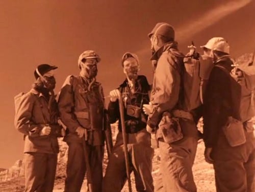 Whoever’s at fault for the wild careening, the group initially appears to take it in stride. “There are times when a mere scientist has gone as far as he can, when he must pause and observe respectfully while something infinitely greater assumes control,” Eckstrom philosophizes. But they become a little more alarmed when they step outside their rocket (with only winter coats and oxygen masks for protection) and discover evidence of a long-lost civilization ravaged by radiation.