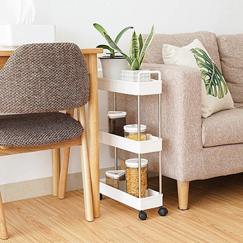 This slim storage cart is so practical, you’ll find dozens of uses for it. Handy for pantries, laundry rooms, home offices, and school rooms, the cart has four wheels, three tiers, and handles for moving it around. It’s sold in three colors, and also comes in a four-tier version.