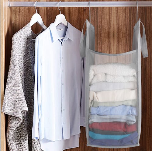 This clever hanging hamper offers an ingenious solution for keeping dirty laundry out of sight. Designed with two hooks and handles for carrying, it can go right in your closet, but is also super handy for traveling with, thanks to its collapsible design. Choose from gray or black.