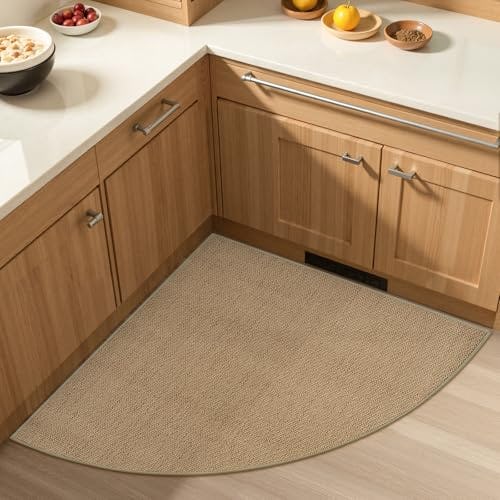 KIMODE Farmhouse Kitchen Rugs Non Slip Washable,Circular Sector Kitchen Mats for Floor Radius 39",Absorbent Corner Kitchen Sink Rug for Laundry Room Home,Beige/Khaki