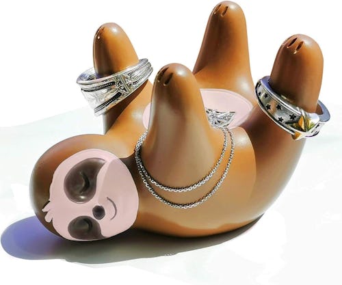 This little sloth figurine is ridiculously cute — he’s just a sleepy little guy. But as he snoozes on his back, his little legs are the perfect place to keep your rings, giving them a designated spot. This plastic holder is perfect for your bathroom, nightstand, or kitchen to add both personality and functionality.