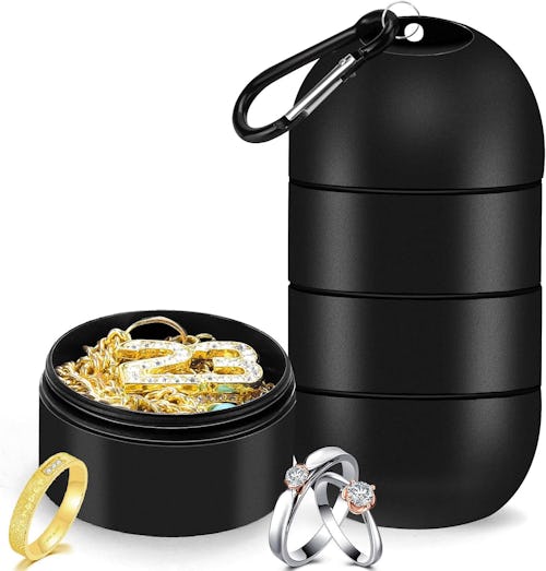 Ideal for traveling, this compact jewelry case comes with an attached carabiner and is small enough to clip onto a keychain or your bag. It has three tiers that feature three separate compartments, and is an ideal size for holding and organizing a few of your favorite pieces. Made of durable rubber, it’s waterproof with an airtight seal to keep things safe.
