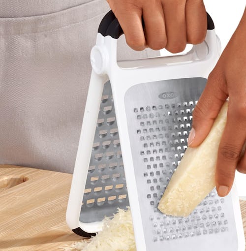 Avoid wrestling with a box grater like it’s bear trap. This OXO folding grater features detachable, ultra-sharp stainless steel grates, in coarse and medium, and handles cheese, veggies, and even chocolate with ease. You can use it flat over a bowl or folded out a cutting board, and it stores flat in a drawer. Nonslip feet and a soft grip handle ensure stable, comfortable use.