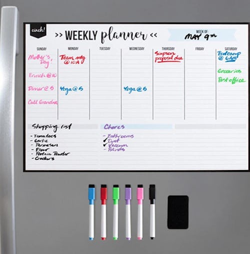 Display this weekly planner on your fridge to stay organized and on top of plans. The planner is magnetic, so it doesn’t require hanging hardware — just keep it on your fridge for easy access. Use dry erase markers on the the whiteboard surface, and you’ll be able to easily wipe it clean at the end of each week.