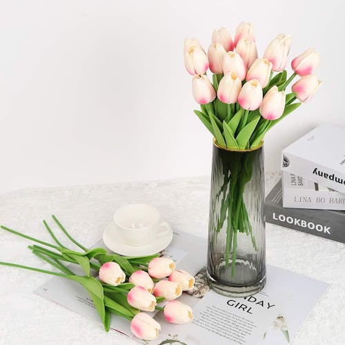 These artificial tulips never wilt, so you can have the look of fresh flowers all year round. Made from high-quality PU, the tulips look and feel realistic and the stems are flexible, so you adjust the arrangement to your needs. The tulips come in a bunch of colors, and if they start looking dusty, you can revive them with the swipe of a wet cloth.