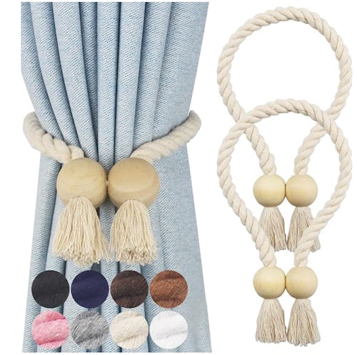Keep your curtains open and show off your windows with this set of elegant woven rope tiebacks. The curtain tiebacks feature a woven cotton design along with magnetic balls that firmly and easily connect together. And the tiebacks accommodate different types of curtain fabric; you can adjust the length based on fabric thickness.