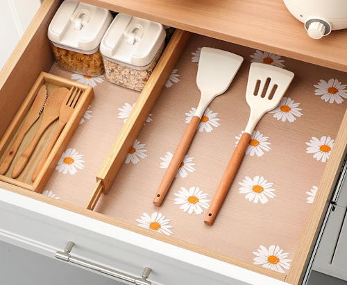 Shelf liners can serve double duty by keeping surfaces cleaning and adding a little personality to the inside of drawers and cabinets. These BPA-free liners are available in a variety of sizes and patterns and since they’re waterproof, you can just wipe them clean. Plus, they’re easy to cut to size and won’t leave behind a sticky residue.