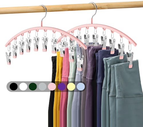 Hanging up items like leggings and workout wear can be tricky, but these curved hangers come with clips that grip items tightly. The hangers come in a pack of two, and each one comes with 10 clips. The clips feature a tight hold and have a rubber-coated surface to prevent fabric creases and pulls.