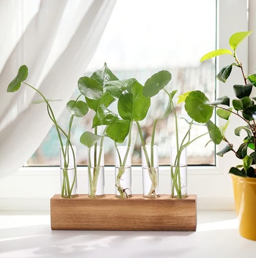 Show off your favorite clippings, grow herbs, or propagate a plant in this wooden and glass terrarium. The terrarium features five borosilicate glass vases that you can fill with water and plants. The wooden stand offers a stable base for the plants and is sturdy enough for the windowsill or a desktop.