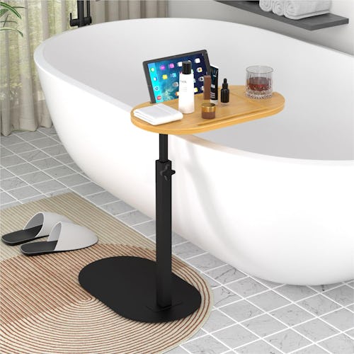 Use this adjustable bamboo tray table to keep items like your phone, tablet, or favorite drinks handy while you lounge in the tub or on the couch. The tray table comes equipped with a sturdy metal base and an adjustable pole. It features a water-resistant surface and even has a dedicated space for your wine glass or mug.