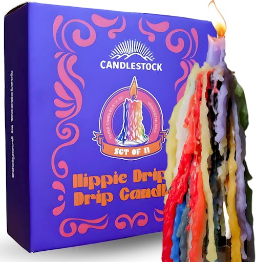 Stick one of these colorful candlesticks into a wine bottle or candlestick holder, light it, and see as the wax cascades down, creating a new piece of stylish art. These candles have retro charm and are meant to look a little messy, like a beautiful rainbow of unscented wax.