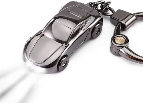 Add functionality and a touch of fun at the same time with this popular flashlight keychain shaped like a sports car. Made of durable zinc alloy, it features two LED lighting modes: a bright light and a strobe.