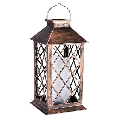 A solar-powered lantern with a flickering flame effect