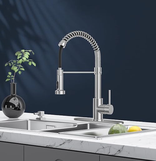 This faucet doesn’t just look sleek — it works hard, too. The high-arc spring design swivels 360 degrees, while the pull-down nozzle switches between stream and spray modes. Made from brass and stainless steel, it’s designed to resist corrosion while being easy to clean. The faucet comes in three finishes to best match your kitchen.