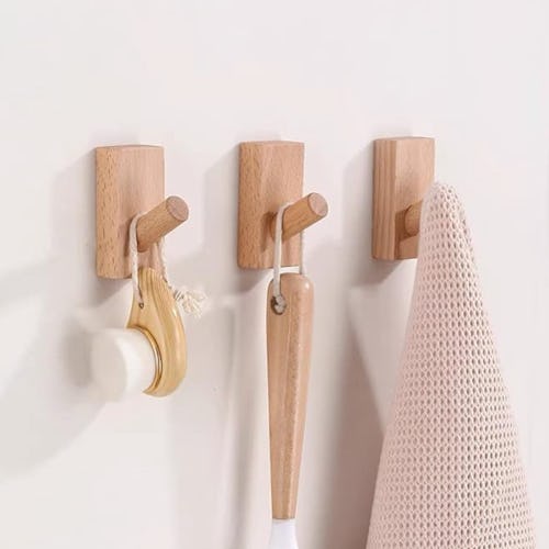 Wooden adhesive hooks that are ideal for hats, towels, & more